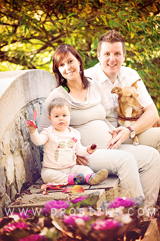 Čez slabo leto je sledilo družinsko slikanje v naravi. Hčerka je že pokazala kakšen nov gib, mami pa trebuščka. Seveda ni manjkala psička. ;)
